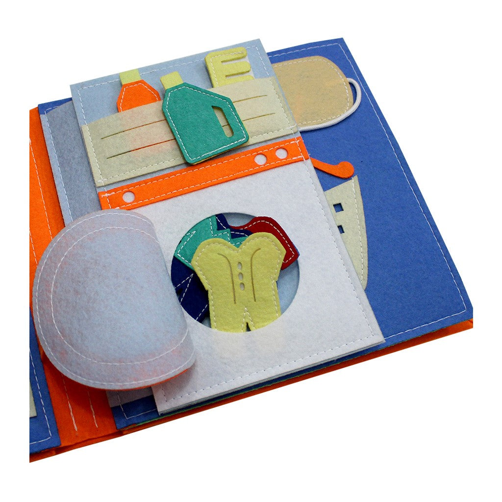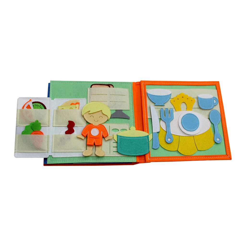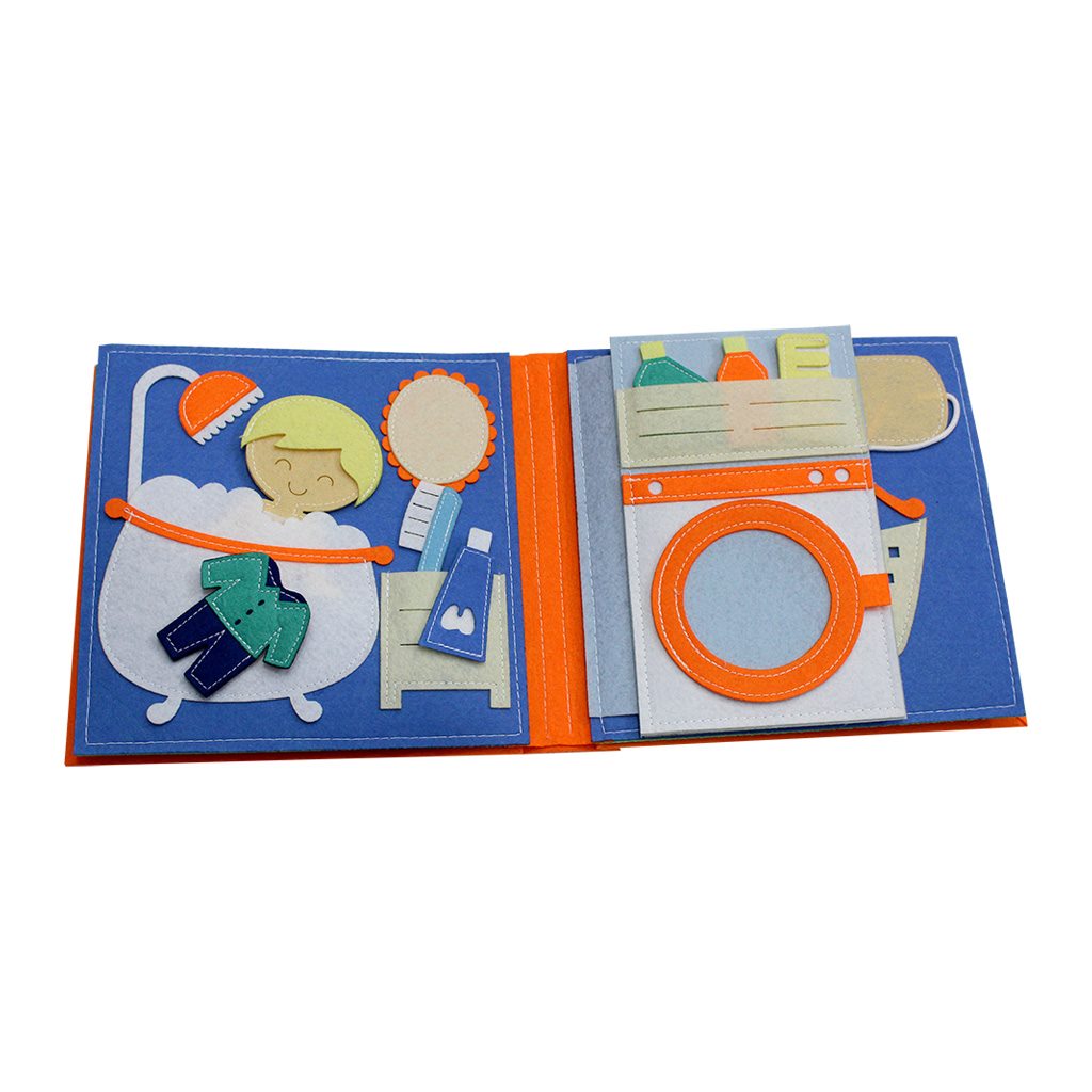 The One Fine Day book feature a 20x20cm page and contain 8 pages, with comprehensively crafted in felt textile material. This book is suitable for boys from 3-6 years old. This lovely book contains familiar daily activities in the bedroom, wardrobe, kitchen, dining room, bathroom, laundry…There are also many objects to go with each activity to help develop kid’s creativity.