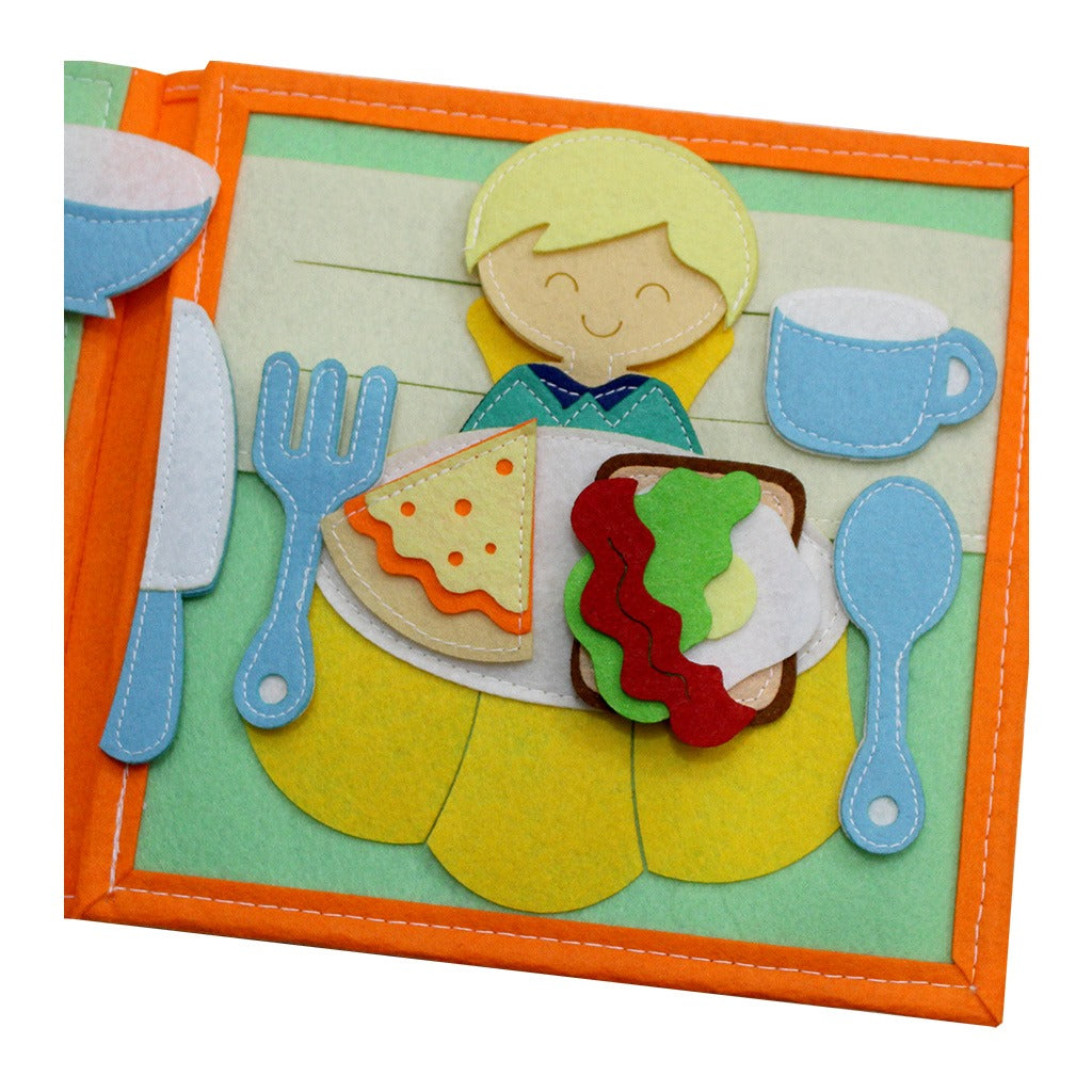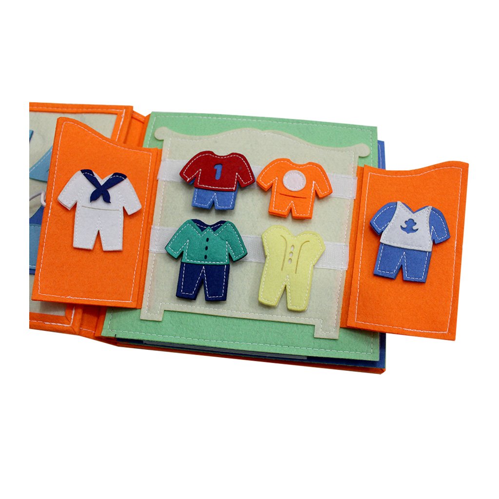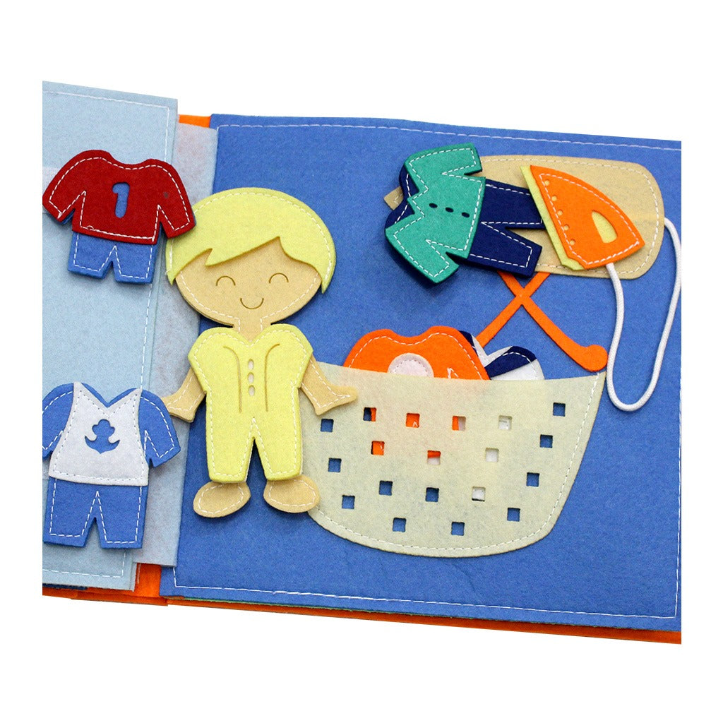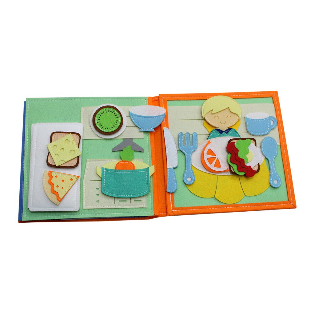 The One Fine Day book feature a 20x20cm page and contain 8 pages, with comprehensively crafted in felt textile material. This book is suitable for boys from 3-6 years old. This lovely book contains familiar daily activities in the bedroom, wardrobe, kitchen, dining room, bathroom, laundry…There are also many objects to go with each activity to help develop kid’s creativity.