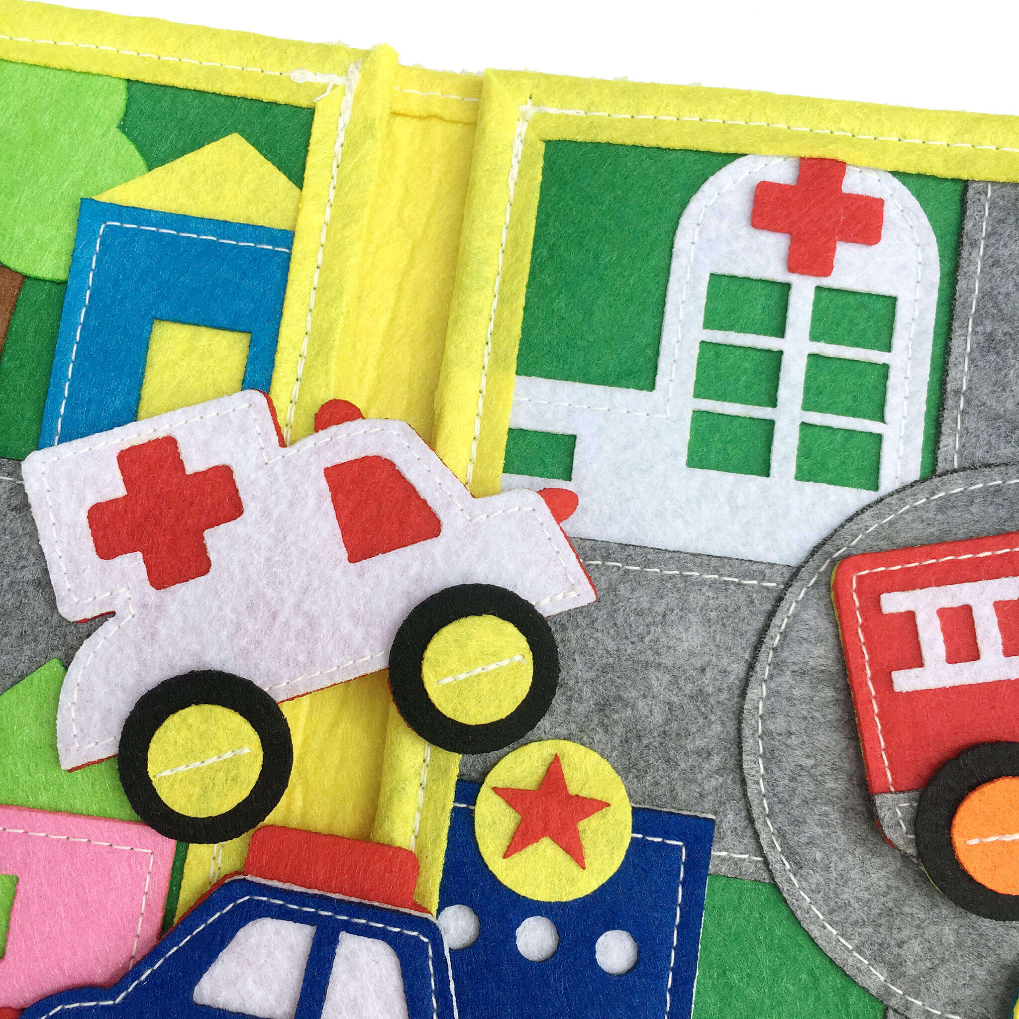 What's on the Road? features 2 pages of fun and learning. This book is suitable for small baby and toddler to practice their sensory and motor skills. Traffic book will help the kids to distinguish different types of vehicles such as police car, emergency car, fire engine, bus, taxi and traffic lights.